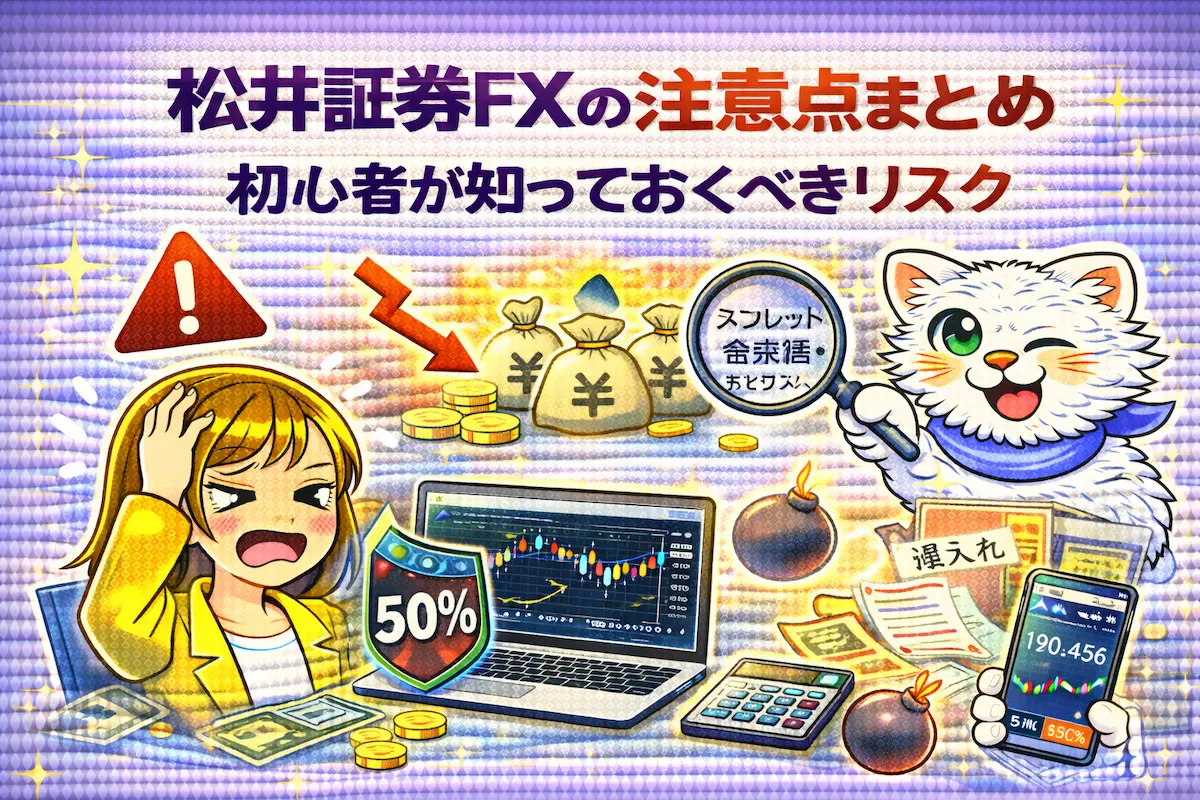 松井証券FXにおける最大の注意点は「低リスクに見えることによる油断」そのものです。しかし、レバレッジを低倍率に固定し、スプレッド拡大時間を徹底して避け、余剰資金をMATSUI Bankに控えておくことで、リスクの9割はコントロール可能です。