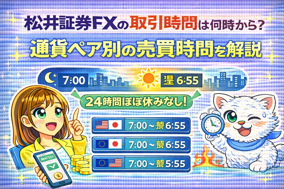 松井証券FXでは、原則として平日は24時間、土日を除きいつでも取引が可能です。 ただし、米国のサマータイム導入(3月第2日曜〜)により、終了時間が1時間早まる点には注意が必要です。 特に初心者は、流動性が低下しスプレッドが広がりやすい「早朝5時〜7時」の取引を避け、活発に動くロンドン・ニューヨーク市場の重なる時間帯に注目するのが賢明です。